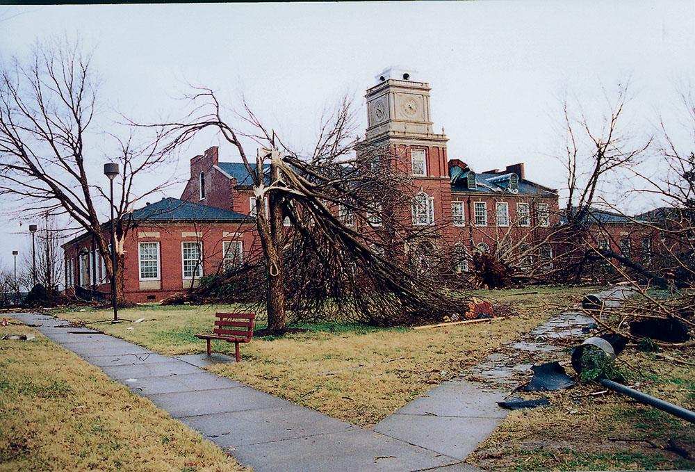 In the early morning hours of January 22, 1999, an F-3 tornado struck downtown Clarksville and the APSU campus. The Clement, Harned, Harvill and Archwood Buildings were severely damaged, while many others suffered broken windows and roof damage. Fortunately, no one was killed. Some 130 shattered trees littered the campus and added to the gloomy sight of shattered buildings. The University quickly initiated "Operation Restoration," with a commitment to have classes reopen within one week. Many heavily damaged buildings were re-opened within one year.